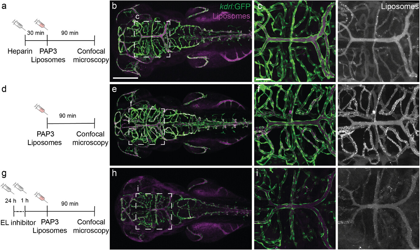 bECs targeting by PAP3 liposomes is inhibited by heparin and an EL lipase inhibitor. a) Timeline of injection and imaging. b,c) Biodistribution (10x and 40x magnification) of PAP3 liposomes at 1.5 hpi, after heparin (1 nl, 50 mg ml−1) administration. d) Timeline of injection and imaging. e,f) Biodistribution (10x and 40x magnification) of PAP3 liposomes, as a reference, at 1.5 hpi. g) Timeline of injection and imaging. h,i) Biodistribution (10x and 40x magnification) of PAP3 liposomes at 1.5 hpi, after a double administration (24 and 1 h prior liposome injection) of an EL inhibitor (XEN445, 1 nL of 50 µM). All zebrafish larvae, Tg(kdrl:GFP) at ≈78 hpi. Liposomes (5 mM, 0.2% mol DOPE-LR) formulated by extrusion. Scale bars: 200 µm (whole embryo) and 50 µm (tissue level).