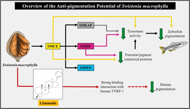 Fig. 12. An overview of the anti-pigmentation potential of S. macrophylla. The potential pathways mediated by S. macrophylla seeds in decreasing zebrafish tyrosinase activity and therefore reducing the melanin formed in the embryos. Pure limonoids from the seed too may potentially be a good inhibitor against human TYRP-1, decreasing human pigmentation. (Coloured lines indicate the influence of each extract, fraction, or compound against pigment formation. Yellow: SMCE; grey: SMEAF; pink: SMHF; Blue: SMWF; red: limonoids. The dashed lines represent possible effect on skin pigmentation. The green arrows represent downregulation.) (For interpretation of the references to colour in this figure legend, the reader is referred to the web version of this article.).