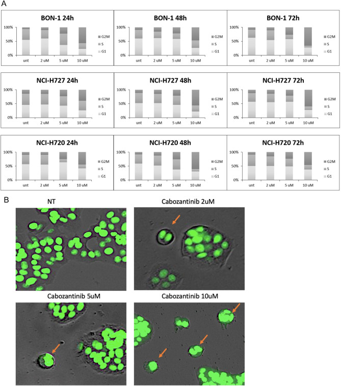 (A) The indicated cell lines were treated (in independent experiments, performed in triplicate) with different doses of cabozantinib (µM), for the indicated times. Distribution of cells in the different phases of cell cycle was measured by propidium iodide. (B) BON1 cells were stained for DNA content: arrows point to cells arrested during mitosis in a polynucleated state. A full-colour version of this figure can be found at