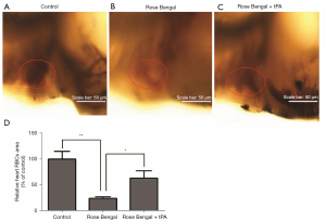 Fig. 5 Quantitative assay of intracardiac thrombosis. (A) Control group, (B) Rose Bengal group, (C) Rose Bengal + tPA group, (D) comparison of intracardiac thromboses, red circles indicate thrombus in the zebrafish heart shown by O-dianisidine staining of the red blood cells. *, P<0.05; **, P<0.01. tPA, tissue plasminogen activator.