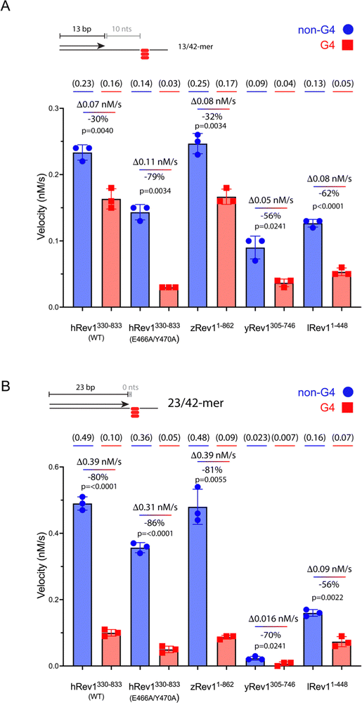 Fig. 2 Rev1 catalysis is sensitive to G4 positioning relative to the primer terminus. (A) Single-nucleotide insertion experiments were performed with hRev1 (WT and EY mutant), zRev1, yRev1, and lRev1. A 13-mer primer was annealed to a 42-mer template strand containing either a non-G4 control sequence or the Myc 14/23 G4 motif. The initial rate of dCMP insertion was measured (nM s−1) and plotted for each enzyme. The absolute value for the rate of product formation is shown in parentheses above each data column. The absolute difference between the non-G4 and G4 DNA substrates, along with normalized change in activity for the G4 substrate, is noted for each enzyme. (B) Single-nucleotide insertion experiments were performed with hRev1 (WT and EY mutant), zRev1, yRev1, and lRev1. A 23-mer primer was annealed to a 42-mer template strand containing either a non-G4 control sequence or the Myc 14/23 G4 motif. The initial rate of dCMP insertion was measured (nM s−1) and plotted for each enzyme. The absolute value for the rate of product formation is shown in parentheses above each data column. The absolute difference between the non-G4 and G4 DNA substrates, along with normalized change in activity for the G4 substrate, is noted for each enzyme. Results shown represent the mean (± std. dev.) for three independent replicates. In both panels, results are shown for non-G4 control DNA substrates (blue circles) and G4 DNA substrates (red squares). The percent decrease in activity was calculated for each enzyme by considering the non-G4 control to be 100% active compared to the G4 substrate. The reported p-values were calculated by using an unpaired Student's t-test with Welch's correction.