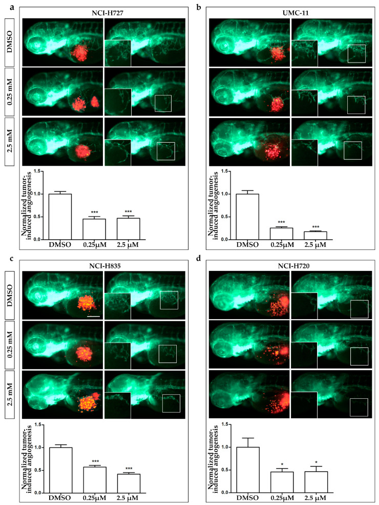 Effects of AXI treatments on tumor-induced angiogenesis in zebrafish embryos implanted with lung carcinoid cells. Representative epifluorescence images of