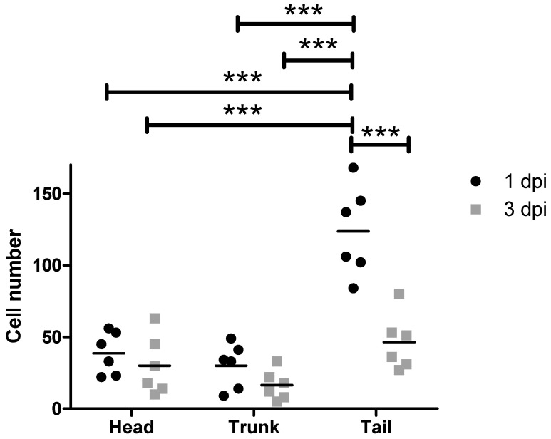 Dissemination of MDA-MB-231 cells after injection with the standard workflow into zebrafish larvae. Depicted are the absolute MDA-MB-231 cell numbers in the head, trunk and tail at 1 and 3 dpi (n = 6). dpi: days post injection. ANOVA followed by post hoc Bonferroni test, *** 0.0001 <