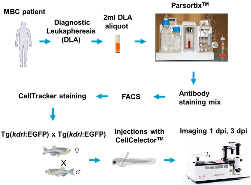 DanioCTC Workflow. A MBC patient undergoes diagnostic leukapheresis (DLA). CTCs are enriched from a DLA aliquot with the Parsortix system and isolated by FACS after staining. Cells are further stained by CellTracker Red for tracking in zebrafish embryos. Single CTCs are isolated by using the CellCelector and injected into 2 dpf old Tg(