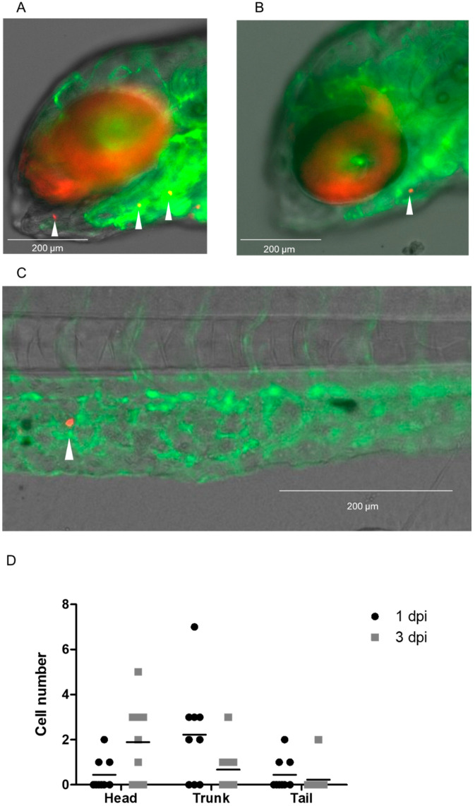 Dissemination of isolated CTCs of a MBC patient after injection with the DanioCTC workflow. Isolated CTCs, labeled in red, were monitored at 1 and 3 dpi and showed dissemination into the head, trunk and the tail. (