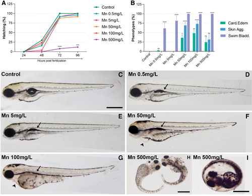 Fig. 1 Mn treatment affects hatching and induces heart, swim bladder, and skin alterations. Zebrafish eggs were treated with Mn at 0.5, 5, 50, 100, and 500 mg/L and analyzed under a light microscope. Only 500 mg/L of Mn showed a significant inhibition of hatching (A, I). The zebrafish larvae also showed alteration in the swim bladder after treatment with all Mn concentrations tested (B, D–G), whereas cardiac edema and skin aggregates were found only after treatment with Mn levels higher than 50 mg/L (C, F–H). The results are expressed as mean ± SEM. The groups were performed with n = 5, where ****p < 0.0001, ***p < 0.001, **p < 0.01, *p < 0.05 versus control group. ns = nonsignificant. Statistical analysis was performed using one-way ANOVA followed by Tukey's post-test. Scale bar in C, H, and I = 500 μm. Arrowhead = cardiac edema; arrow = swim bladder; * = blood. ANOVA, analysis of variance; Mn, manganese; SEM, standard error of the mean. Color images are available online.