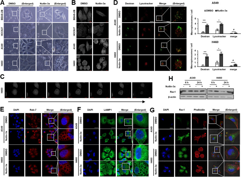 Nutlin-3a induces huge cytoplasmic vacuoles in KRAS MT/p53 WT NSCLC cells. Cells were treated with nutlin-3a (30 μM) for 6 (D, H) or 24 h (A, B, EH). A, B Representative live cell images captured by light (A) and holotomography microscope (B) show huge cytoplasmic vacuoles in KRAS MT/p53 WT but not KRAS WT cells. C Time-lapse video capture images (24 h) of H460 obtained by holotomography microscopy show increase in macropinosomes volume with time and membrane rupturing in the end. D Nutlin-3a induced formation of huge vacuoles were incorporated with dextran (green), but not merged with LysoTracker (red). Representative live images were obtained by confocal laser scanning microscopy (left). Number of macropinosomes were quantitated from the captured image (right) (n ≥ 8). EG Representative images obtained by confocal laser scanning microscopy. Fixed cells were stained with Rab7 (E), LAMP1 (F), or Rac1 (green), and rhodamine–phalloidin (red) (G) and were counterstained with DAPI (blue). H Western blotting of Rac1 expression. *p < 0.05, **p < 0.01, ***p < 0.001 compared with control. Scale bar: 200 μm (A), 7 μm (B, C), and 20 μm (D-G)