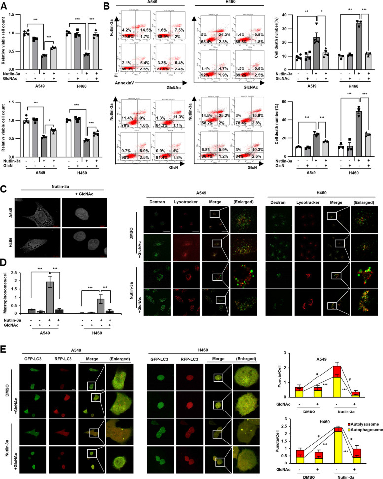 Nutlin-3a-induced methuosis-like cell death is associated with the HBP in KRAS MT/p53 WT NSCLC cells. Cells were supplemented with GlcNAc (40 mM) or GlcN (200 μM) for 24 h with or without nutlin-3a (30 μM). A, B Both GlcNac and GlcN rescue cell proliferation and death, which was analyzed by cell counting (A), and flow cytometry using annexin V/PI staining (B). Representative flow cytometry graph, and statistical histogram of four independent experiment are shown. C Live cell images captured by holotomography microscopy show that GlcNAc supplementation rescues the formation of huge cytoplasmic vacuoles induced by nutlin-3a. D Cells were incubated with dextran and LysoTracker for 2 h with GlcNAc or nutlin-3a. GlcNAc supplementation with nutlin-3a recovers dextran uptakes compared to only nutlin-3a treated cells (n ≥ 22). E Autophagy flux disruption recovered by supplementation of GlcNAc with nutlin-3a, which was detected after transfection of mRFP-GFP-LC3 tandem vector (n ≥ 20). Representative images were obtained by confocal laser scanning microscopy and quantitated from the captured image (D, E). Scale bar: 7 μm for (C), and 10 μm for (D-E). *p < 0.05, **p < 0.01, ***p < 0.001 compared with control