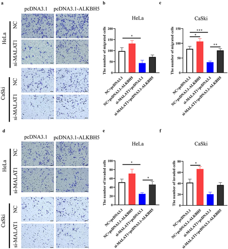 Fig. 7 Effect of ALKBH5 on suppression of cell migration and invasion by silencing MALAT1. Both HeLa and CaSki cells were transiently transfected with siMALAT1 and ALKBH5 expression vector alone or combination. (a-c) Cell migration assay was performed, and the representative fields were photographed (scale bar: 100 μm). The numbers of migrated cells were also counted based on three independent experiments. (d-f) Cell invasion assay was also performed, and the representative photos and the numbers of invaded cells are shown as described above.
