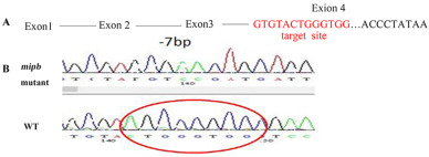 Fig. 2 Mipb mutants resulted in the synthesis of a truncated protein (A) The fourth exon of mipb was selected as the target site for CRISPR/Cas9. (B) A 7-bp deletion was identified in exon 4 of mipb−/− by sequencing.