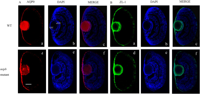 Fig. 4 Distribution of MIP and ZL-1 protein in mutant lens (A) While mutant lens demonstrated a great decline in Mip protein (AQP0) expression compared to that in WT lens. (B) Diffuse distribution of ZL-1 positive signal was observed in the mutant lens while it was mainly located in the lens epithelial cells and elongating fiber cells in WT fish lens. AQP0: red, ZL-1: green; DAPI: blue. Scale bar = 25 μm.