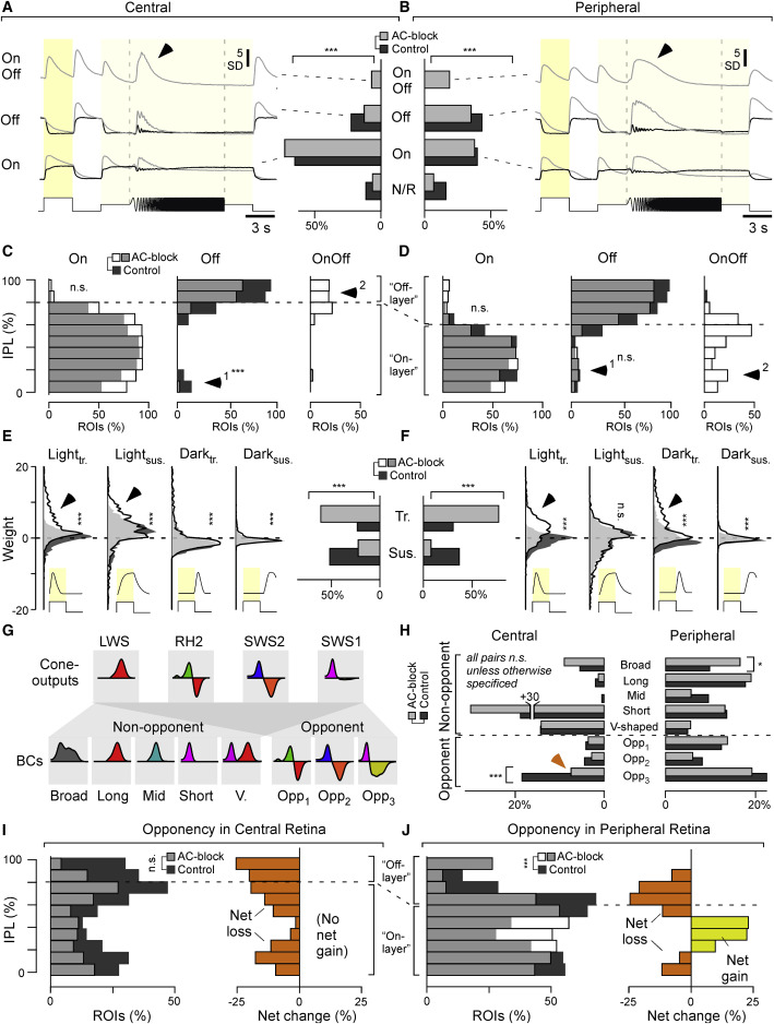 Fig. 5 ACs differentially modulate grayscale processing in BCs across the eye (A and B) Bar plots: distribution of BC ROIs recorded in the central (A) and peripheral retina (B) by response polarity (non-responsive, On, Off, On-Off) before (control, dark gray) and after blocking inhibitory inputs (AC block, light gray), as indicated (chi-square tests for the bar plots, p < 0.001 for both datasets), and the corresponding mean response waveform to the white chirp stimulus (cf. Figure 4C) of all terminals in a given category. Arrowheads highlight distinct temporal dynamics during temporal flicker across the regions. Central: n = 1,492 ROIs under the control condition and 1,566 ROIs under the AC block condition from 13 scans in 13 fishes; peripheral: n = 1,526 ROIs under the control condition and 1,639 ROIs under the AC block condition from 13 scans in 13 fishes. (C and D) Distribution of On, Off, and On-Off BC terminals across the IPL, as indicated, with control data shown in dark gray and AC block data superimposed semi-transparently in white, so that overlapping bars appear in light gray. Note that the On/Off boundary differs between the central (C) and peripheral retina (D; see also Bartel et al.,18 Zimmermann et al.,19 and Zhou et al.33). Arrowheads highlight key differences between central and peripheral histogram pairs. Two-sample Kolmogorov-Smirnov test; central: On, p = 0.77; Off, p < 0.001; peripheral: On, p = 0.30; Off, p = 0.11. Because of the absence of data points under control conditions, no statistical tests were used to test changes for On-Off distributions. (E and F), Distribution of kinetic component weights used to fit BCs’ white step responses (cf. Figure S1B; STAR Methods) across the datasets and conditions as indicated (vertical histograms) and distribution into overall transient and sustained response types (bar plots). Arrowheads highlight the major differences across control and AC block conditions in each case. Wilcoxon rank-sum test for the distribution plots, p = 0.93 for the peripheral lightsus group, p < 0.001 for all other groups; chi-square test for the bar plots, p < 0.001 for both datasets. (G) Illustration of how cone input could build the different spectral response types in BCs. Insets indicate approximate spectral tuning functions (amplitude y versus wavelength x). The top row shows the four cones,7 and the bottom row shows BCs,18,19 divided into five non-opponent and three opponent categories. (H) Percentages of ROIs per spectral category (cf. G) based on BC kernels (cf. Figure 4E) for central (left) and peripheral datasets (right). Note that the distribution across spectral categories differs strongly by retinal region, but within a region, most spectral categories are approximately stable between control (dark gray) and AC block conditions (light gray). The main exception to this observation is indicated by the arrow. Wilcoxon rank-sum tests, central: p > 0.05 for the first 7 groups, p < 0.001 for “Opp3” group; peripheral: p = 0.015 for the “Broad” group, p > 0.05 for all others. (I and J) Left: IPL distributions (I, central retina; J, peripheral retina) of all ROIs classed as color opponent during the control condition (dark gray) and following AC block (white, so that their overlay is light gray). Right: difference between control and AC block in each case, with net loss of opponency shown in orange and net gain in yellow. The full datasets leading to the summaries in (H–J) are shown in Figures S7B–S7E. Two-sample Kolmogorov-Smirnov test for changes in IPL distributions of opponent terminals; central, p = 0.39; peripheral, p < 0.001.