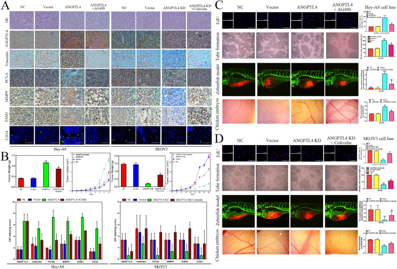 ANGPTL4 promotes OC growth and angiogenesis by activating the JAK2/STAT3 pathway in vivo. A Morphological observation and HE and IHC staining of xenografts in the NC-SKOV3, Vector-SKOV3, ANGPTL4 KD-SKOV3, ANGPTL4 KD-SKOV3 with Colivelin, NC-HeyA8, Vector-HeyA8, ANGPTL4 OE-HeyA8, and ANGPTL4 OE-HeyA8 with AG490 groups. B The tumor weight and volume and the IHC staining score of xenografts in the NC-SKOV3, Vector-SKOV3, ANGPTL4 KD-SKOV3, ANGPTL4 KD-SKOV3 with Colivelin, NC-HeyA8, Vector-HeyA8, ANGPTL4 OE-HeyA8, and ANGPTL4 OE-HeyA8 with AG490 groups. C The proliferation and tube formation of HUVECs cultured with the CM of HeyA8 cells were tested by EdU staining and tube formation assays. The chick chorioallantoic membrane assay measured the angiogenesis ability of HeyA8 CM in vivo. Angiogenesis ability of HeyA8 cells in a zebrafish model. The experimental groups were NC, Vector, ANGPTL4 OE and ANGPTL4 + AG490. D The proliferation and tube formation of HUVECs cultured with the CM of SKOV3 cells were tested by EdU staining and tube formation assays. The chick chorioallantoic membrane assay measured the angiogenesis ability of SKOV3 CM in vivo. Angiogenesis ability of SKOV3 cells in the zebrafish model. The experimental groups were NC, Vector, ANGPTL4 KD and ANGPTL4 KD + Colivelin. *P < 0.05, **P < 0.01, ***P < 0.001