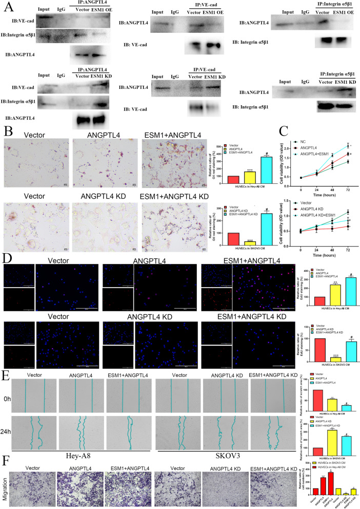ESM1 inhibits ANGPTL4 binding to integrin α5β1 and VE-cadherin, which represses HUVEC proliferation and migration to induce vascular permeability in the tumor microenvironment.