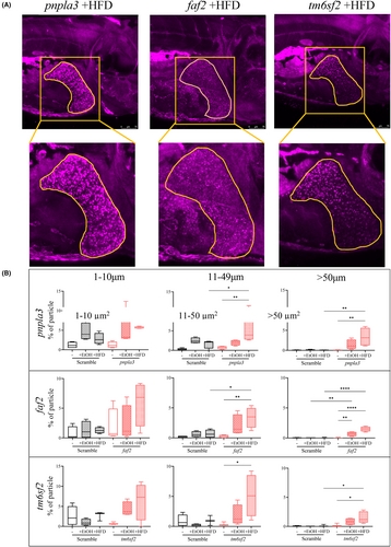 Fig. 5 Nile Red staining showed larger size lipid droplets in 2% ethanol- or HFD-treated crispants. (A) Representative images show the liver area selected to calculate the lipid droplets size count in pnpla3, faf2 and tm6sf2 crispants treated with HFD, stained with Nile Red (magenta) and imaged using confocal microscopy. (B) Percentage of number of lipid droplet size (μm2), 1–10, 10–50 and greater 50 was measured using Fiji ImageJ software in scramble control and pnpla3, faf2 and tm6sf2 larvae on 5 dpf following 48 h of exposure to 2% EtOH and HFD.