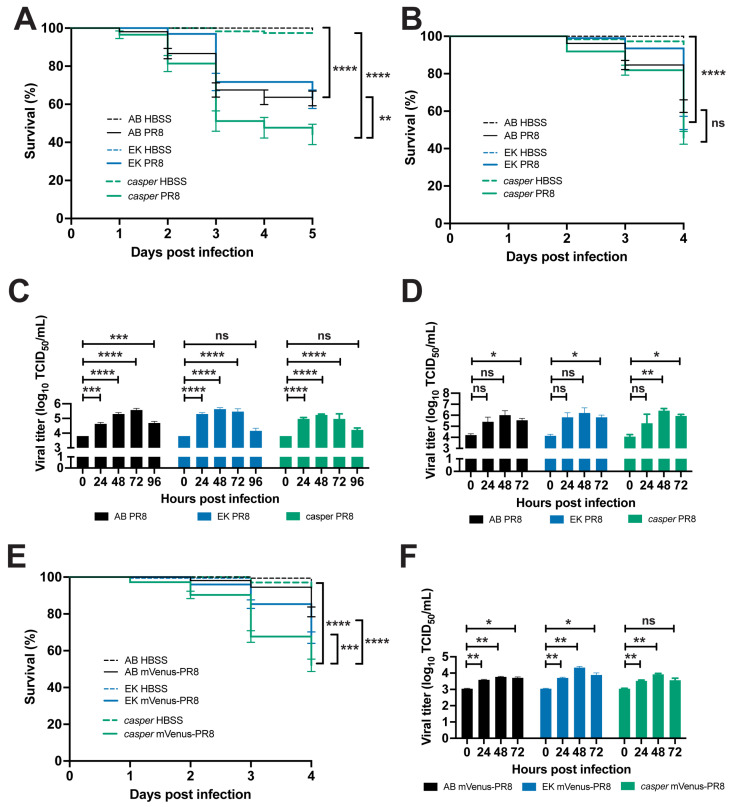 Characterization of PR8 and Color-flu systemic infection across zebrafish lines. (A) Decreased survival was greater in casper than AB or EK lines with 2 dpf systemic PR8 infection. PR8-infected zebrafish had a decreased survival rate compared to vehicle (HBSS) controls (p < 0.0001 for all lines). Casper zebrafish had a lower survival rate than EK (p = 0.0024) and AB (p = 0.0055) according to the log-rank Mantel–Cox test. (B) Decreased survival rates were observed in AB, EK, and casper with 3 dpf PR8 infection compared to controls (p < 0.0001 for all lines). No significant (ns) difference in survival rate was detected between PR8-infected AB, EK, and casper larvae. (C) Increased TCID50 viral titer in 2 dpf PR8-infected AB, EK, and casper zebrafish at 24, 48, and 72 hpi compared to 0 hpi (adj. p-value < 0.001 for all comparisons except for AB 24 hpi (adj. p-value = 0.0006) and AB 96 hpi (adj. p-value = 0.0003)). (D) Increased TCID50 viral titer in 3 dpf PR8-infected AB, EK, and casper zebrafish at 72 hpi compared to 0 hpi (adj. p-value = 0.0323, 0.0211, and 0.0452, respectively) and casper zebrafish at 48 hpi compared to 0 hpi (adj. p-value = 0.0063). (E) Decreased survival with 3 dpf mVenus-PR8-infected AB, EK, and casper zebrafish compared to HBSS controls (p < 0.0001 for all lines). As observed with PR8 infection, casper zebrafish had the lowest survival rate (67.7%), which was lower than that of AB (94.5%, p < 0.0001) and EK (85.5%, p < 0.0002). (F) mVenus-PR8-infected AB, EK, and casper zebrafish had an increased viral titer at 24 and 48 hpi compared to 0 hpi (adjusted p-values = 0.0012 and 0.0022, respectively, for AB; 0.0025 and 0.0027, respectively, for EK; and 0.0045 and 0.0066, respectively, for Venus-PR8). mVenus-PR8-infected AB and EK zebrafish had an increased viral titer at 72 hpi compared to 0 hpi (adjusted p-value = 0.0236, and 0.0281, respectively). Survival studies were conducted with four independent (n = 4) experiments and 50 larvae per sample group. TCID50 assays were carried out with three independent (n = 3) experiments and 25 larvae per group for each time point. Not significant (ns), p > 0.05; * p < 0.05; ** p < 0.01; *** p < 0.001; **** p < 0.0001.