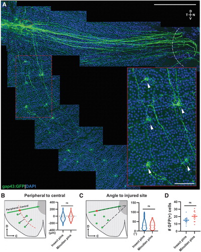 Fig. 6 Ventral RGCs project axons circumferentially to the injury site. (A) Representative retina flat-mount image from a 3-day postinjury retina with magnification showing GFP+ RGCs (white arrowheads) from the ventral side of the injury projecting axons to the injury site (red circle: injured site, white curve: optic nerve head). (B) Schematic description and quantification of circumferential projecting GFP+ RGCs distribution relative to the injury site. (C) Schematic description and quantification of circumferential GFP+ RGCs relative angle to injury site. (D) Mean number of circumferential GFP+ cells activated postretina penetrating injury. In (B, C), 126 GFP+ cells from insect pins and 215 GFP+ cells from Minutien pins group were measured for violin plot. Data in (D) are presented as mean ± SEM. All data were acquired from ∼5 retinas, 3 animals. ns by Student's t-test. Scale bar = 200 and 50 μm.