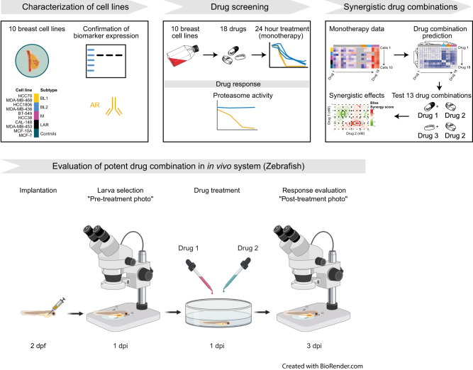Characterization of cell lines was performed using key marker for breast cancer (androgen receptor [AR]). Drug screening was performed using 18 drugs on 10 cell lines, and proteasome activity was measured for proteasome inhibitors to measure their ability to suppress the β5 site on the 20 S proteasome. The synergistic effect and inhibitory potency of 13 drug combinations were tested on five cell lines (CAL-148, HCC38, HCC1806, MCF-7 and MDA-MB-468). The data obtained in monotherapy were used to predict potent drug combinations by IDACombo. The predicted combinations plus combinations used in clinical practice were evaluated. This figure was designed using assets from Freepik.com (