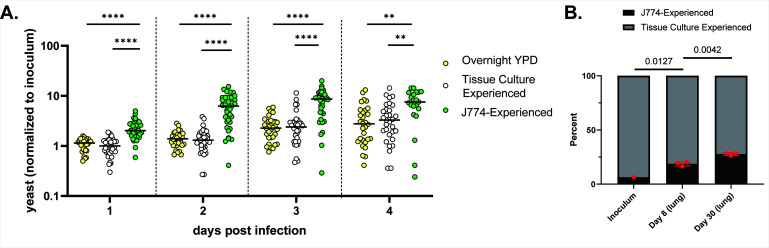 MECs show enhanced virulence in zebrafish larvae and mouse lungs. (A) Larvae inoculated with 20–70 fluorescent yeast prepared in one of three ways. Counts were performed by eye via live microscopy at 2 hpi and 1 through 4 days post-infection (dpi). Live counting allows for the assessment of yeast in expected and unexpected locations and focal planes. Charted are daily yeast counts normalized to counts at 2 hpi. Statistical comparisons represent the results of Mann-Whitney tests of log-transformed ratios. (B) Comparative fungal burden of TC-experienced (gray) and J774-experienced Cn in the lungs of mice infected intranasally with 1 × 104 total CFU. Statistical comparisons represent unpaired t-tests of log-transformed ratios.