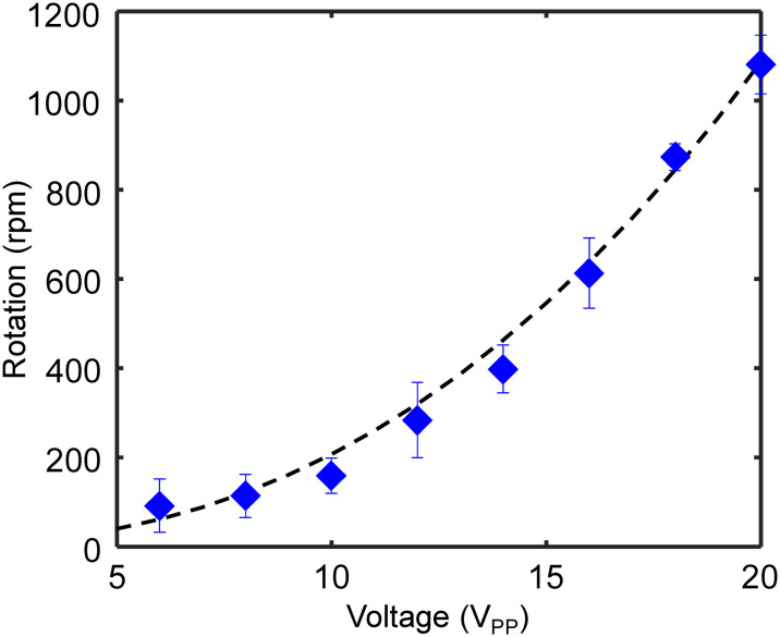 Plot of the rotational velocity of zebrafish larvae against ultrasound excitation voltage. The ultrasound excitation frequency was kept at 185 kHz. The black dotted curve denotes the fitting with the power function expression,