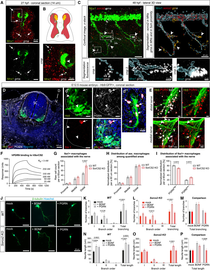 Fig. 5 PGRN-induced motor neurite outgrowth requires SorCS2 expression in MNs (A) HCR3.0 on Tg(mnx1:GFP)ml2 embryos shows enriched grna in close proximity to motor axons (arrows) at 27 hpf, while sorcs2 is expressed by MNs (arrowhead). (B) Illustration depicting sorcs2 expression by MNs (yellow) and skeletal muscle (red), while grna (white) is enriched along motor axons (green). (C) HCR3.0 of grna and sorcs2 in Tg(mnx1:GFP)ml2 embryos at 48 hpf followed by Imaris-based segmentation. grna transcripts were filtered in cells within 5 μm proximity to Mnx1+ surface (orange; arrowheads) and inside the MNs (white). (D and E) (D) IF of PGRN and Iba-1 in coronal sections of brachial spinal cord of Hb9:GFP/+ embryos at E12.5. Hb9+ MNs express PGRN (arrowheads). PGRN is highly expressed by Iba1+ microglia (d′) and macrophages (d″) (arrows). (E) PGRN+ macrophages at branching points of medial and distal nerves. Some nerve-associated macrophages have low PGRN (arrowheads). SC, spinal cord; D, dorsal; V, ventral. (F) Surface plasmon resonance revealed concentration-dependent binding of hPGRN to immobilized hSorCS2. (G‒I) Quantification of PGRN+ macrophages associated with the Hb9+ motor axons in brachial spinal cord at E12.5. (G) Sorcs2 KO embryos exhibit more macrophages associated with the distal motor nerve. (H) Distribution of associated macrophages among quantified areas. (I) Distribution of nerve-associated macrophages in relation to their intracellular PGRN levels. n = 3 sections/embryo, 4 embryos/genotype. (J) IF of primary MN cultures grown without stimulation (mock), with 5 ng/mL BDNF, or with 100 ng/mL PGRN. (K‒P) Quantification of primary motor axon outgrowth as number of branches (K–M) and neurite length (N–P) of primary, secondary, and tertiary neurites, and when summarized. WT: mock = 37 neurons (n.), BDNF = 37 n., PGRN = 39 n. Sorcs2 KO: mock = 36 n., BDNF = 38 n., PGRN = 31 n. All graphs show mean ± SEM. See also Figure 1, Figure 2, Figure 3, Figure 4, Figure 5, Figure 6, Figure 7and Table S2.