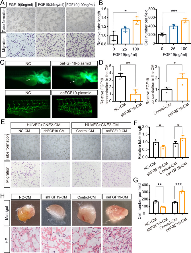 NPC cells secrete FGF19 into HUVECs and promote angiogenesis. A: Tube formation assays (top) and Transwell migration assays (bottom) were performed to measure tube formation and migration of HUVECs treated with increasing doses of FGF19. B: The relative tube length and number of migrated HUVECs were quantified. C: Morphology of subintestinal vessels (SIVs) in