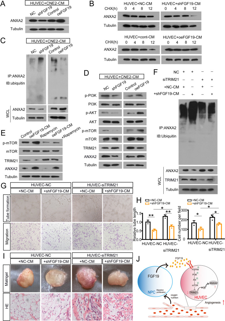 NPC-derived FGF19 upregulates ANXA2 by blocking TRIM21-mediated ubiquitination. A: ANXA2 expression in HUVECs treated with shFGF19-CM or oeFGF19-CM. B: ANXA2 expression in HUVECs treated with shFGF19-CM or oeFGF19-CM following CHX treatment for the indicated times. C: HUVECs treated with shFGF19-CM or oeFGF19-CM were immunoprecipitated with ANXA2 antibody and analysed by immunoblotting with the anti-ubiquitin antibody to examine ANXA2 ubiquitination. D: Western blot analysis of PI3K/AKT/mTOR in HUVECs treated with shFGF19-CM or oeFGF19-CM. E: Western blot analysis of p-mTOR in HUVECs with the treatment of oeFGF19-CM or the addition of rapamycin. F: HUVECs were transfected with siTRIM21 and treated with shFGF19-CM or NC-CM. Then cells were immunoprecipitated with ANXA2 antibody and analyzed by immunoblotting with the anti-ubiquitin antibody to examine ANXA2 ubiquitination. G: Tube formation assays (top) and Transwell migration assays (bottom) were performed to measure tube formation and migration of HUVECs pretransfected with siTRIM21 and cocultured with shFGF19-CM or NC-CM. H: The relative tube length and number of migrated HUVECs were quantified. I: HUVECs transfected with siTRIM21 or NC and cocultured with shFGF19-CM or NC-CM were mixed with Matrigel for subcutaneous injection. Top: Gross observation of angiogenesis in Matrigel plugs. Bottom: H&E staining was performed to observe blood vessel formation in different groups. J: A working model of FGF19 promoting NPC angiogenesis by influencing TRIM21-mediated ANXA2 ubiquitination through the activation of the PI3K/Akt/mTOR pathway. Data represent the mean ± SD of three independent experiments. *