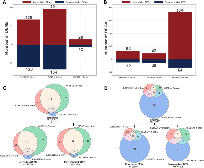 Effects of mRNA and miRNA transcriptome alterations by CSE exposure. The column diagram displaying the DEM and DEG counts (