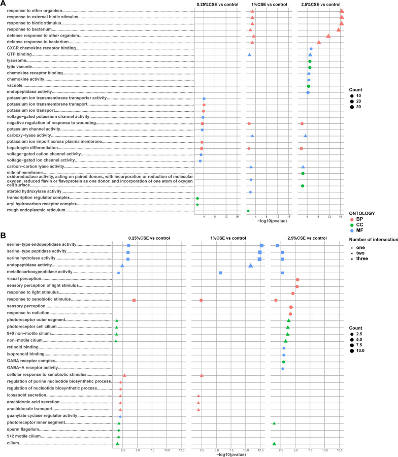 GO functional enrichment analysis in DEG group exposed by CSE. Top 5 GO terms of MF, CC, and BP categories with the greatest significance in up-regulated (