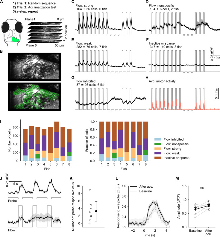 Fig. 6 Granule cell (GC) responses reveal absence of the error signal. (A) Schematic of the experimental protocol. (B) A representative imaging plane (top) and regions of interest (ROIs) drawn around GC cell bodies using semiautomated anatomical segmentation (bottom). Scale bar, 20 μm (C to G) Functional response types identified using correlation-based clustering. The cluster label, the number of cells (means ± SD), and the number of fish in which the cluster was found are inset in each panel. (H) Average motor activity overlaid on the optic flow stimulus trace. (I) The number and relative proportions of GCs in each cluster across fish. (J) Top: Response of probe responsive cells identified using cross-correlation with stimulus regressor. Bottom: Response of the same cells shown on top to optic flow at 1 cm/s. (K) Number of cells identified as probe responsive. (L) Average response of the probe responsive cells to negative probe pulses after acclimatization and when presented at random (baseline). (M) Response amplitude of the probe responsive cells to negative probe when presented randomly compared to the amplitude after acclimatization. ns, P = 0.11 by Wilcoxon signed-rank test. Traces shown in (C) to (H), (J), and (K) are means ± SEM.