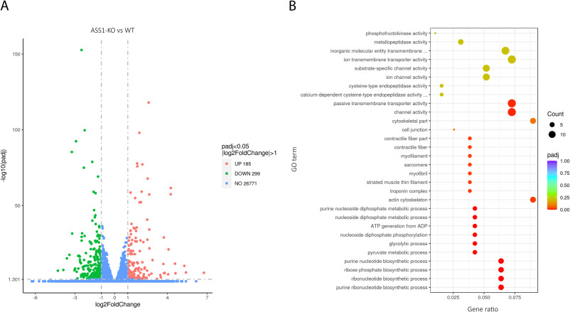 Fig. 6 ASS1 deficiency is associated with distinct alterations of gene expression mainly involving (ribo)nucleotide metabolism and cerebral channels/receptors. Total RNA of mock- or MO-injected zebrafish larvae was extracted at developmental age 1 dpf using TRIzol reagent. RNA sequencing was commercially perfomed at Novogene Company Ltd. (UK) according to the service provider's protocols. (A) Volcano plot illustrating differentially expressed genes in ASS1-deficient (ASS1-KO) versus wildtype (WT) zebrafish larvae. Data are expressed in log2FoldChange (abscissa) and -log10(padj) (ordinate). Values for each gene with log2(FoldChange)| ≥ 1 and padj ≤0.05 were considered significant. Whereas the majority of 26,771 genes was not altered between both cohorts, 484 were significantly differentially expressed in ASS1-KO larvae with 185 genes being upregualted and 299 genes being downregulated. (B) Scatter plot of GO enrichment analysis in ASS1-KO zebrafish larvae depicting the ratio of the number of differentially expressed genes linked with a specific GO term to the total number of differential genes (abscissa) for the most significantly enriched GO terms (ordinate). The size of a point represents the number of genes annotated to a specific GO term, and the color grading from red to purple represents the level of significance of enrichment (padj). Alterations in gene expression in ASS1-deficient zebrafish larvae clustered in distinct (metabolic) pathways predominantly involving (ribo)nucleotide metabolism and cerebral channel/receptor expression. (For interpretation of the references to color in this figure legend, the reader is referred to the web version of this article.)