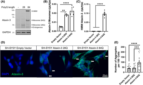Fig. 1 SH-SY5Y cell culture modeling revealed the presence of ataxin-3 aggregates. (A) Immunoblotting SH-SY5Y cells with ataxin-3 confirmed expression of human ataxin-3-28Q and -84Q as well as endogenous ataxin-3. An additional high molecular weight (HMW) band above the 84Q monomeric band was found. (B) Quantification of human ataxin-3 monomers indicated increased ataxin-3 levels in ataxin-3 28Q and 84Q compared to the vector control (p < .001 and p = .0013, respectively; n = 6), and (C) quantification of the HMW ataxin-3 bands revealed that more HMW ataxin-3 was present in the ataxin-3 84Q cells compared to the other genotypes (p < .0001; n = 6). (D) Stably transfected SH-SY5Y cells were confirmed to express human ataxin-3 after immunostaining for ataxin-3. Cells expressing an empty vector control did not display aggregated ataxin-3, however, cells expressing either human ataxin-3-28Q, or ataxin-3-84Q displayed ataxin-3 positive aggregates (indicated by white arrows, scale bar: 20 μm). (E) Quantification of the number of aggregates present revealed that ataxin-3-84Q cells possessed a higher number of aggregates compared to ataxin-3 28Q and the vector control (p = .001 and p < .0001, respectively, n = 19–24). Results are shown as mean ± SEM. Statistical analysis was performed using a one-way ANOVA followed by a Tukey's post hoc test. **p < 0.01, ***p < 0.001, ****p < 0.0001.
