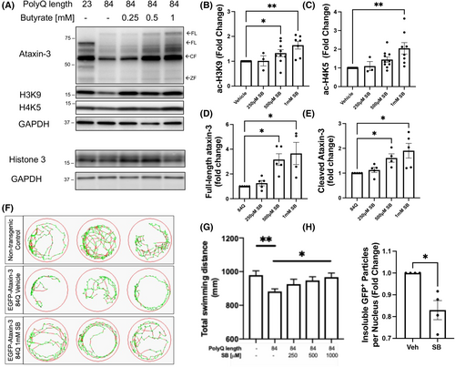 Fig. 3 Sodium butyrate treatment increases histone acetylation and rescues the motor phenotype in SCA3 zebrafish. Zebrafish expressing ataxin-3 84Q were treated with 250 μM, 500 μM, or 1 mM sodium butyrate (SB), or vehicle control, between 1 and 6 days post fertilization (dpf). (A) Protein lysates of the 6 dpf zebrafish treated either SB or the vehicle control underwent western blotting and checked for ataxin-3, acetylated histone 3 at lysine 9 (ac-H3K9), and acetylated histone 4 at lysine 5 (ac-H4K5). Histone 3 was probed as a control. (B) Quantification of ac-H3K9 revealed a dose-dependent increase following SB treatment (500 μM, p = .0481; 1 mM, p = .0014, n = 3–9), while (C) quantification of ac-H4K5 revealed 1 mM SB was able to increase histone acetylation compared to the vehicle control (p = .0018, n = 3–10). (D) Quantification of full-length (FL) ataxin-3 revealed an increase with 500 μM and 1 mM SB (p = .039 and p = .0452, respectively, n = 4–5) while (E) levels of the cleavage fragment of ataxin-3 (CF) also demonstrated an increase with 500 μM and 1 mM SB treatment (p = .0452 and p = .0109, respectively, n = 4–5). (F) Swimming trajectories of 6 dpf zebrafish after treatment with vehicle versus 1 mM SB treatment (Green, slow movement; red, fast movement). (G) Motor behavior analysis showed vehicle-treated ataxin-3-84Q zebrafish swam shorter distances compared to the non-transgenic controls (p = .0085) while 6 dpf ataxin-3-84Q larvae treated with 1 mM SB ameliorated the motor dysfunction (p = .0393, n = 64–158). (H) Flow cytometric analysis of the insoluble GFP+ particles revealed a decrease with SB treatment compared with vehicle (p = .03, n = 4 group replicates). Data represent mean ± SEM. Statistical analysis was performed by a non-parametric one-way ANOVA (Kruskal Wallis) test and comparison between vehicle versus SB was analyzed using an unpaired student t-test. *p < 0.05, **p < 0.01.