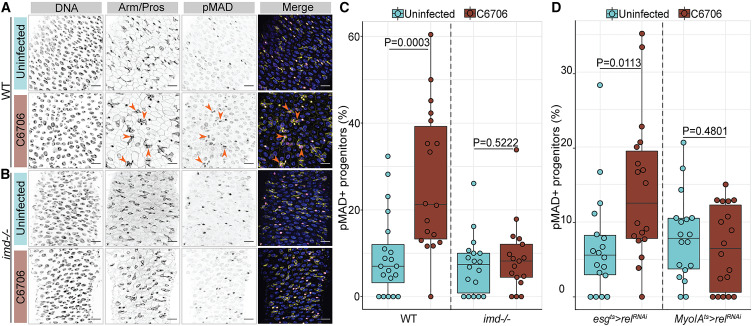 Fig. 3 Vc-responsive activation of BMP requires IMD activity (A and B) Posterior midguts of (A) wild-type (WT) and (B) imd null mutant (imd−/−) adult flies uninfected or infected with C6706 for 24 h. Hoechst labels DNA (blue); Arm/Pros label cell borders and enteroendocrine cells, respectively (yellow); and pMAD labels cells with BMP activation (magenta). Arrows: pMAD+ progenitor cells. Scale bars: 15 μm. (C) Percentage of progenitors that are pMAD+ in WT and imd−/− flies. (D) Percentage of pMAD+ progenitors in esgts>relRNAi and Myo1Ats>relRNAi flies. Each dot represents a measurement from a single fly gut. p values are calculated using unpaired Student’s t tests.
