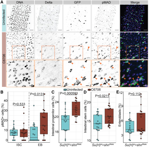 Fig. 5 Vc-responsive BMP activation in EBs arrests intestinal stem cell growth non-cell autonomously (A) Posterior midguts of Su(H)ts/+ adult flies uninfected or infected with C6706 for 36 h. Hoechst labels DNA (blue); Delta marks ISCs (yellow); GFP labels Su(H)+ EBs (green); pMAD labels cells with BMP activation (magenta). Arrows and dashed box: pMAD+ GFP+ EBs. Scale bars in dashed boxes: 5 μm. Scale bars in images: 15 μm. (B) Proportion of intestinal stem cells or EBs that are pMAD+ in Su(H)ts/+ intestines. (C–E) Proportions of all cells that are (C) progenitors, (D) ISCs, or (E) EBs in the intestines with EB-specific BMP inactivation (Su(H)ts>shnRNAi). Each dot represents a measurement from a single fly gut. p values are calculated using unpaired Student’s t tests.