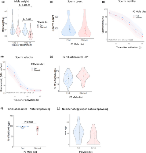 Fig. 2 Starvation leads to altered male fertility traits. (a) Weight of fed and starved males on days 0 and 18 of the experiment. On day 18, the weight of starved males was significantly reduced by 21.83% in 3 independent experiments (starved group Day 0: 0.41 ± 0.08, Day 18: 0.321 ± 0.05, mean ± SD). Individual data points are represented as dots within the violin plots. N = 37. (b) Sperm count in fed and starved males. Bars represent the mean and 95% confidence intervals. (c) Percentage of sperm motility in fed and starved males across 6 time points after sperm activation. (d) Sperm velocity in fed and starved males at 6 time points after sperm activation. (e) Percentage of fertilised eggs at 64-cell stage (2 hpf) and produced by IVF. Individual data points within the violin plot represent the average egg survival rate per male and across 7 independent tanks. N = 49. (f) Percentage of fertilised eggs at 64-cell stage (2 hpf) and produced by natural spawning, Fed males N = 27, Starved males N = 32. Individual data points within the violin plots represent the average egg survival rate per male and across 3 independent rounds of breeding (g). Number of eggs produced per non-experimental females during natural spawning with fed or starved males. Black bars represent the mean ± SD. Shadowing in panels c and d represents 95% confidence intervals.