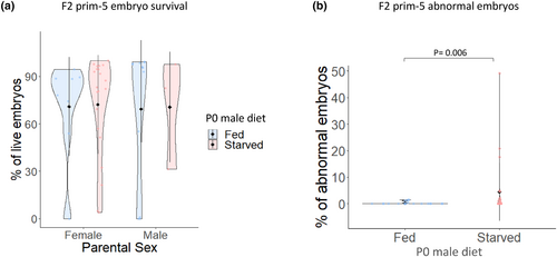 Fig. 4 Paternal starvation does not alter F2 survival but is associated with F2 malformations at 24 hpf. (a) F2 survival at prim-5 (24 hpf): The analysis of several embryo clutches revealed no statistically significant changes on survival between embryos produced by the F1 (either females or males) of fed and starved fathers. Individual data points within the violin plot represent the average embryo survival rate per individual and produced by natural spawning. (b) F2 abnormal embryos at prim-5 stage (24 hpf). Increased number of abnormal embryos was observed in the group laid by F1 fish coming from starved fathers. No statistical differences were found when sex was considered as interaction factor.