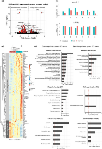 Fig. 5 Paternal starvation leads to changes in embryo transcriptome in prim-5 embryos. (a) Differentially expressed genes in offspring of starved and fed fathers: Volcano plot depicting the differentially expressed genes between embryos from starved and fed fathers. We found 130 genes downregulated and 15 genes upregulated (only genes expressed >1TMM in 50% of the samples, FDR <0.1). A total of 6 samples for each group were included in the analysis. (b) Example of expression levels in downregulated (top: ctss2.1) and upregulated (bottom: klhl31) genes in offspring of starved fathers. Examples are given for all the embryos included in the transcriptomic analysis. (c) Differential expression within experimental groups and deregulated genes: Heatmap showing the variation in downregulated genes (top) and upregulated (bottom) between embryos from starved and fed fathers. (d) GO terms for upregulated genes in embryos from starved fathers. (e) GO terms for downregulated genes in embryos from starved fathers.