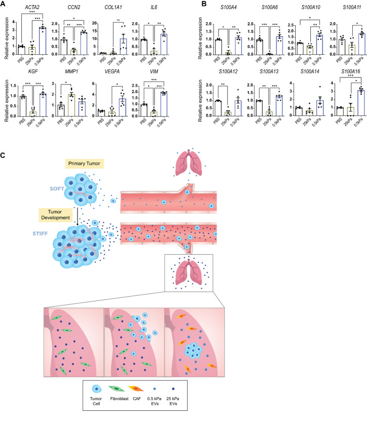 Soft EVs transform the phenotype of resident lung fibroblasts. A and B, Gene expression fold change in ACTA2, CCN2, COL1A1, IL6, KGF, MMP1, VIM, VEGFA, S100A4, S100A6, S100A10, S100A11, S100A12, S100A13, S100A14, S100A16 assessed by qRT-PCR in IMR90 human lung fibroblasts exposed to PBS only, 25 kPa EVs, and 0.5 kPa EVs. Gene expression data normalized to PBS condition. Two biological repeats. Welch ANOVA. C, Schematic showing the arrival of stiff EVs in the lung after being secreted from the primary tumor. Left panel shows a mechanically soft environment, and EVs encountering resident normal lung fibroblasts; (middle) cancer cells are then recruited to the lung; and (right) the cells, now experiencing a soft environment, release soft EVs that transform the resident fibroblasts to a CAF phenotype.