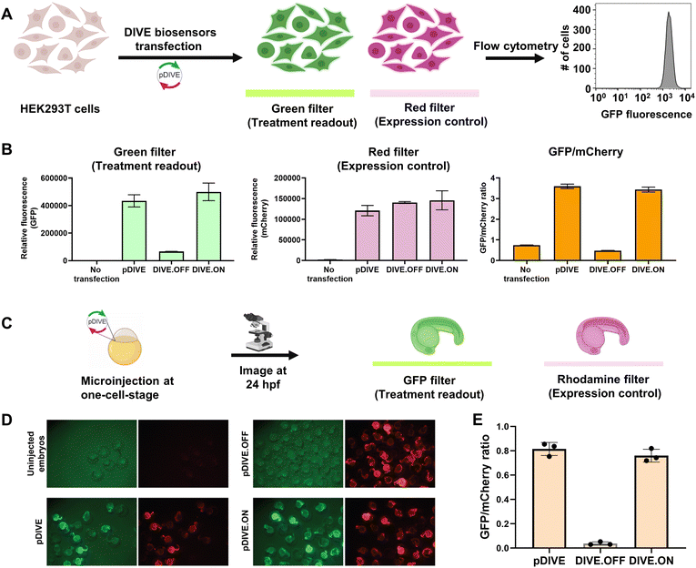 Fig. 1 DIVE platform controls in HEK293T cells and zebrafish embryos. (A) Workflow of the cell assay. (B) Fluorescence measurements for each control: no transfection, the core plasmid pDIVE containing only GFP and mCherry, the DIVE.OFF negative control, and DIVE.ON positive control. GFP and mCherry fluorescence is measured for each cell population. The relative GFP/mCherry ratio is calculated and plotted. Data are the mean and standard deviation of three independent experiments each with technical triplicates. (C) The workflow for testing activity of the DIVE system in zebrafish embryos. WT embryos were injected at the one-cell stage and raised until 1 day post fertilization (dpf). (D) Epifluorescence micrographs from an entire clutch are shown for embryos. (E) Three random embryos from each injection condition were imaged and pixel intensity across the trunk quantified. Embryos lacking the mCherry expression control are not included as this indicates either they were not integrated into the genome or in a region with silent expression. The average GFP/mCherry ratio ± s.d. was plotted. Values for individual fish are shown.