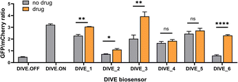 Fig. 2 Comparison of DIVE aptasensors for six drugs. GFP/mCherry ratio for each DIVE aptasensor in HEK293T cells in the presence and absence of its corresponding drug: DIVE_1 with 100 μM aciclovir; DIVE_2 with 1 mM folinic acid; DIVE_3 with 50 μM gardiquimod; DIVE_4 with 2 mM neomycin; DIVE_5 with 500 μM tetracycline; and DIVE_6 with 1 mM theophylline. Data are the mean and standard deviation of three independent experiments each with technical replicates. p values from a two-tailed, unpaired t-test with Welch's correction. Significance summary: p > 0.05 (ns), p ≤ 0.05 (*), p ≤ 0.01 (**), p ≤ 0.0001 (****).