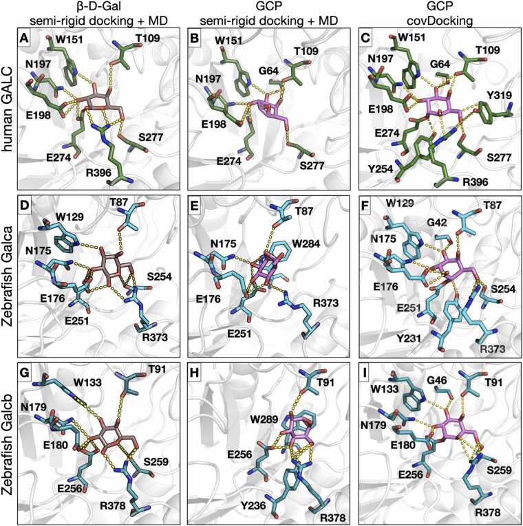 Fig. 1 Binding modes from molecular docking and molecular dynamics simulations of the interaction of β-D-Gal and GCP with human and zebrafish GALC proteins. The active site pockets of hGALC (A,B,C), zebrafish Galca (D,E,F), and zebrafish Galcb (G,H,I) proteins are shown with the orientation of β-D-Gal (left panels) and GCP (center panels) obtained after MD simulation and for GCP obtained upon covalent docking (right panels). Proteins are shown in grey cartoon representation while residues involved in the interactions are shown in stick representation colored by element with green, cyan, or turquoise carbons for hGALC, Galca, and Galcb, respectively. β-D-Gal and GCP are shown in stick representation with carbons colored brown and magenta, respectively. H-bond interactions are shown as yellow dashed lines. The covalent bond between the ligand and the protein is shown between GCP and the neutrophile residue (E274 for human GALC, E251 and E256 for zebrafish Galca and Galcb, respectively).