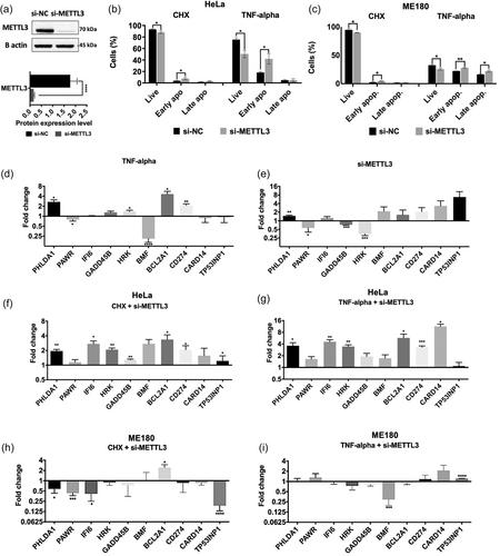 Fig. 3 Effects of METTL3 depletion on RNA abundance. (a) Western blot analysis of HeLa cells transfected with METTL3 siRNA (si-METTL3). Negative control was nontargeting pool siRNA (si-NC) and loading control was ß-actin. (b) The rate of apoptosis in HeLa cells transfected with 25 nM si-METTL3 for 72 h and/or incubated with 37.5 ng/ml TNF-α for 24 h. (c) The rate of apoptosis in ME180 cells transfected with 25 nM si-METTL3 for 72 h and/or incubated with 15 ng/ml TNF-α for 24 h. Cells were stained with Annexin V and 7-AAD and analyzed by flow cytometry. qPCR analyses of PHLDA1, PAWR, IFI6, GADD45B, HRK, BMF, BCL2A1, CD274, CARD14 and TP53INP1 24 h after TNF-α treatment (d), 72 h after METTL3 depletion (e), CHX treatment with METTL3 knockdown (f) and TNF-α treatment with METTL3 knockdown (g) in HeLa cells, CHX treatment with METTL3 knockdown (h) and TNF-α treatment with METTL3 knockdown (i) in ME180 cells. All data are representative of three independent experiments. CHX, cycloheximide. Two-tailed Student's t test was performed to determine the statistical significance among groups. All data are presented as mean ± SD. *p ≤ 0.05, **p ≤ 0.01, ***p ≤ 0.001 ****p ≤ 0.0001.