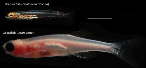 Fig. 1 Comparison of adult Danionella dracula and zebrafish, Danio rerio. Shown here are a male D. dracula and a male from the Casper line of zebrafish. Note the hypertrophied lower jaw of D. dracula. Scale bar indicates 5 mm.