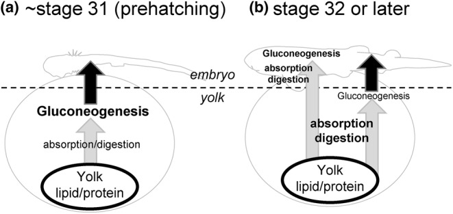 Model of functional changes in the yolk sac over the near‐prehatching stages. (a) Until stage 31, where pre‐hatching takes place, yolk degradation, absorption, and gluconeogenesis occur mainly in the yolk sac; (b) At stage 32 or later, yolk degradation and absorption become more active in both embryonic gut and yolk sac, and glucogenesis and other processes occur actively in the embryo.