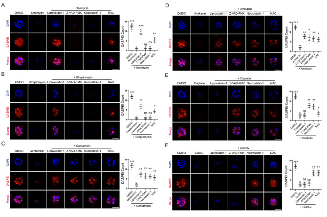 Otoprotection against various ototoxin-induced lateral line neuromast damage by inhibitors of different cell death pathways. Typical confocal images and quantitative results of otoprotection assay. (