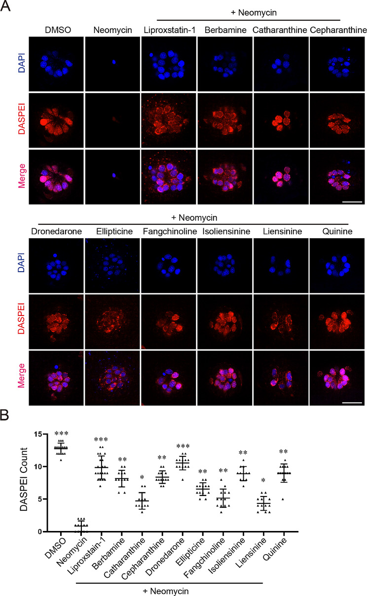 Otoprotection screening against neomycin-induced hair cell damage in zebrafish lateral line. A Representative otoprotection results of the nine positive hit compounds identified from our screen. Liperoxstatin-1 is a positive control. Scale bar: 20 μm. (