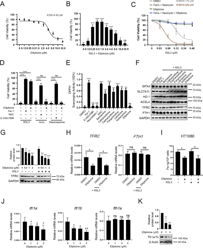 Ellipticine inhibits ferroptosis by downregulation of TFRC and iron homeostasis. A Ellipticine toxicity assay in HT1080 cells. Data represent mean ± s.d. from three biological repeats. (