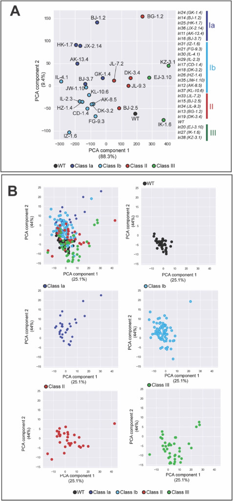 Fig. 3 Principal component analysis (PCA) dimensionality reduction analysis-based mutant classification. (A) The PCA dimensionality reduction plot of wild-type and recovered mutants based on the mean values of biliary network structural sub-parameters within the allele indicates the similarity of phenotypes. Colors denote the defined class of that specimen group: Wild-type (Black), Class Ia (Dark Blue), Class Ib (Light Blue), Class II (Red), and Class III (Green). Proximity of the data points indicates the relative similarity of the recovered mutants; the closer the points, the more closely related the phenotypes are. (B) The PCA plot of all individual larvae of wild-type and recovered mutants analyzed in this study based on biliary network structural sub-parameters. The plot is labeled based on the assigned classes: Wild-type (Black), Class Ia (Dark Blue), Class Ib (Light Blue), Class II (Red), and Class III (Green). The same plots showing only the data from each class are shown separately. Each class of mutants was distributed in a pattern that partially overlapped but was still clearly distinct.