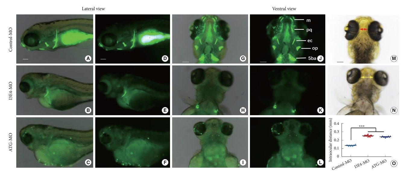 Fig. 3 Loss of best1 causes abnormal craniofacial structure and interorbital distance. (A–N) Representative bright field and fluorescent images of zebrafish head skeleton at 6-dpf. In vivo visualization of the skeleton is achieved by the administration of a fluorescent dye (Calcein) directly to the fish water. Dyes that bind to calcified matrix can be used to label the entire skeleton. Lateral view (A–F) and ventral view (G–L) of the head skeleton of day-6 embryos labeled with Calcein. (B, C, E, F, H, I, K, and L) When embryos were injected with best1-morpholino (MO) at the one-cell stage, the amount of stained mineralized tissue was significantly reduced compared to fish injected with control-MO. Panel N show increased intraocular distance (yellow arrows) in best1 morphants. Panel M and N show measurements of the distance between the eyes, and panel O shows the distances depicted graphically as the mean for 10 embryos of each type. Columns, mean; standard error of the mean (n = 10; analysis of variance), ***p < 0.0001. Scale bar, 100 μm. 5ba, fifth branchial arch; op, opercular bone; ec, ectopterygoid; e, ethmoid plate; pq, palatoquadrate; m, Meckel cartilage; dpf, days postfertilization.
